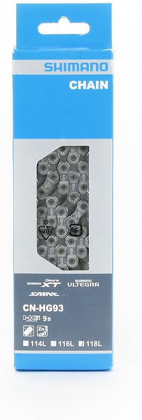 シマノ CN-HG93は、9スピード用として設計されたハイパフォーマンスチェーンで、DEORE XT / SAINTシリーズに分類される最上位グレードの製品です。この位置づけ自体が、シマノが本製品に寄せる期待と技術力の高さを物語っています。リンク数は114Lと118Lの2種類が用意されており、様々な自転車のフレームサイズやギア構成に対応できる汎用性を持っています。